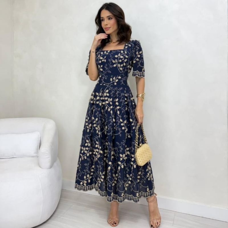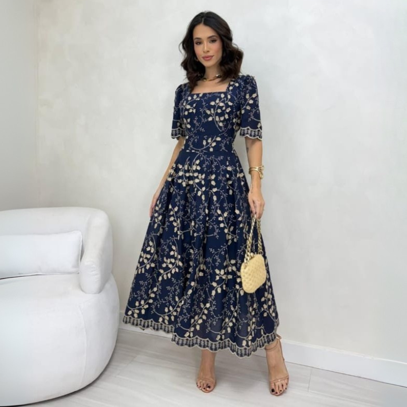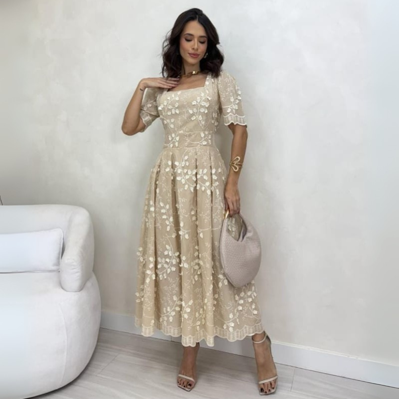 Sua modelagem evasê valoriza a silhueta com cintura marcada, busto ajustado e saia fluida, que garante movimento leve e natural a cada passo. O decote quadrado acrescenta um toque clássico, enquanto o forro interno oferece segurança e caimento impecável.