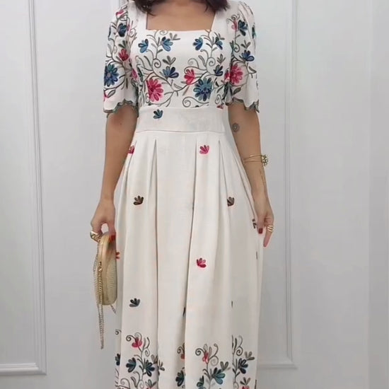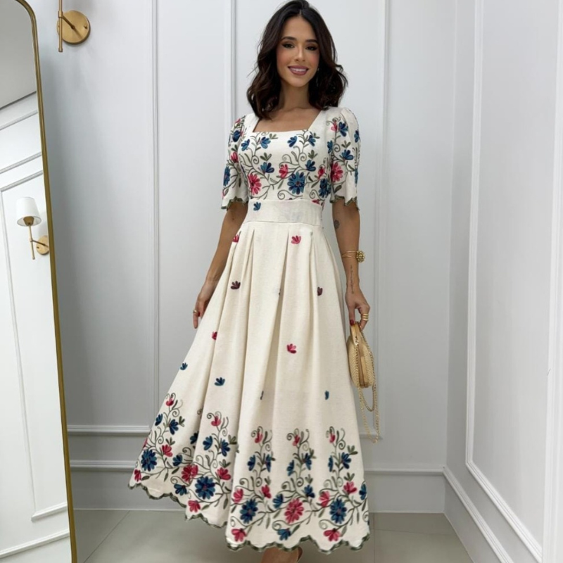 Além disso, o decote reto garante delicadeza e equilíbrio, enquanto o lastex nas costas oferece ajuste perfeito ao corpo, tornando o uso ainda mais confortável. Sua saia ampla e fluida, totalmente forrada, adiciona movimento e graciosidade, criando um visual atemporal para qualquer ocasião.