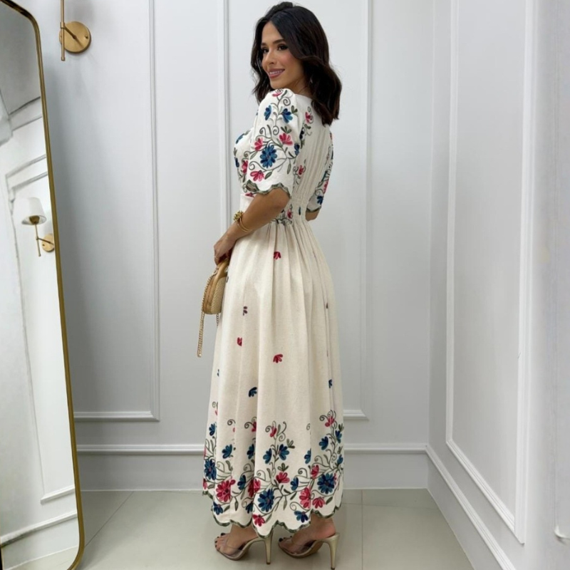 • Bordado artesanal em flores e ramos nas mangas e barra.